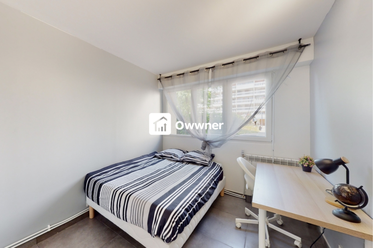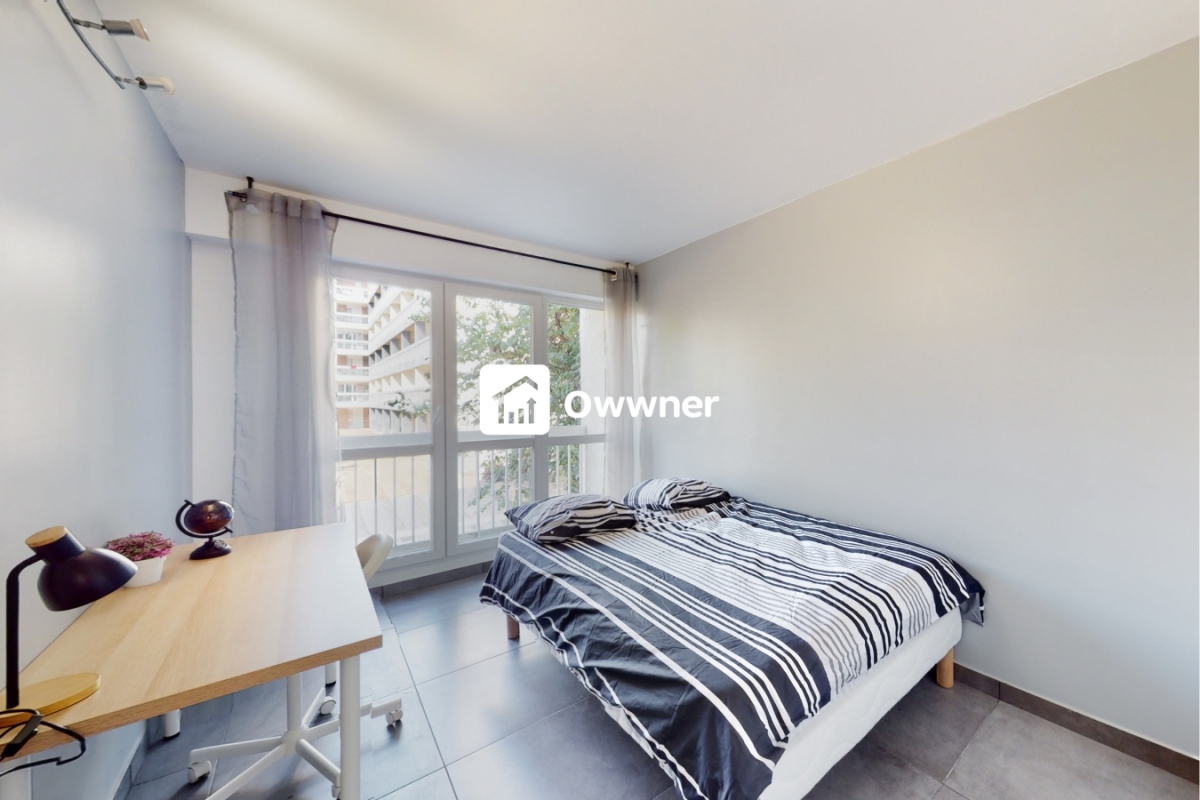 La chambre à louer dispose d’un lit double, d’un bureau avec chaise roulante, d’une armoire encastrée ainsi que de rangements complémentaires répartis dans l’appartement.